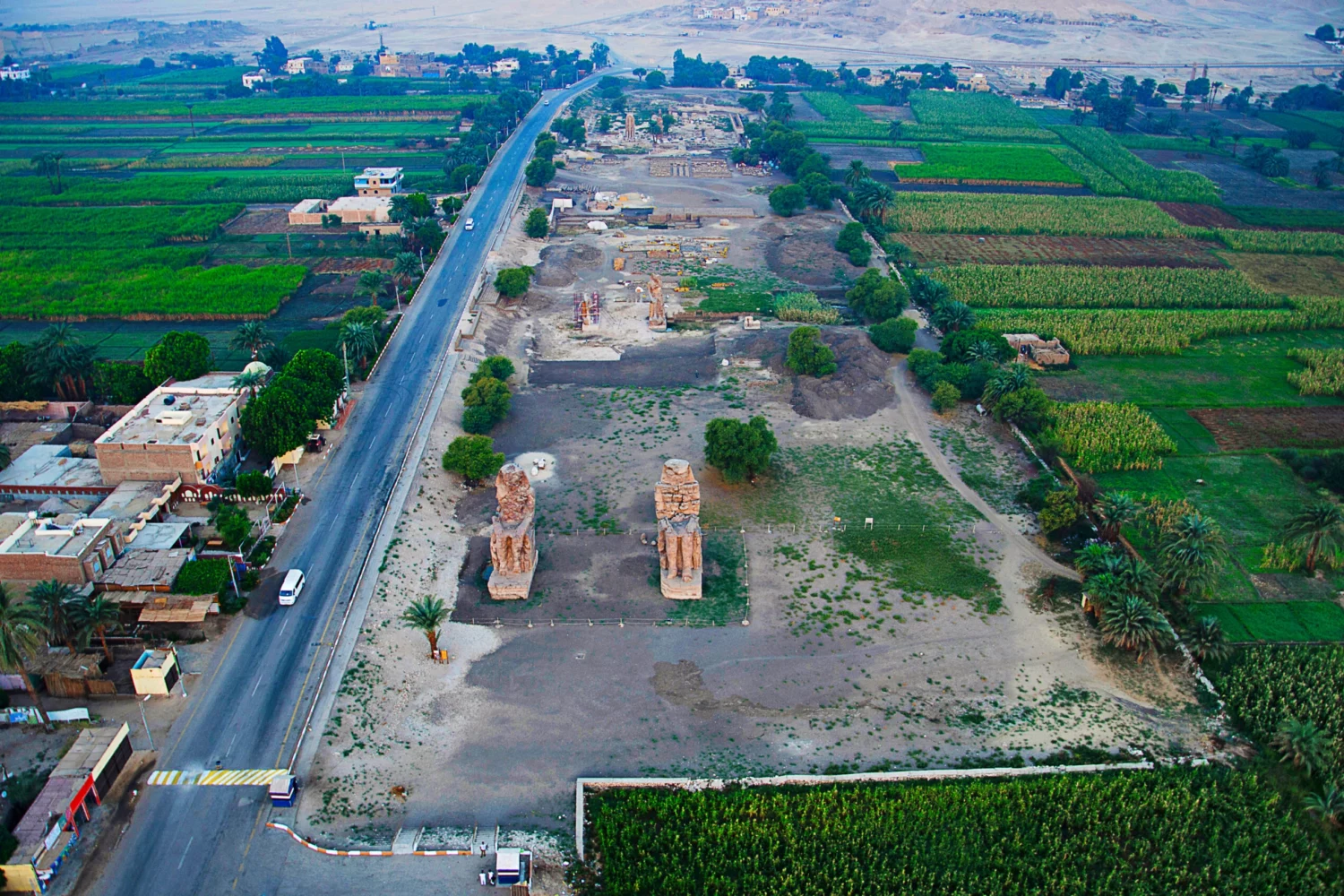 Nuestra última parada de Cisjordania será en las ruinas de los gigantes COLOSOS DE MEMNÓN, son dos estatuas que representan al faraón Amenhotep III y que fueron construidas para presidir su templo mortuorio en la orilla oeste del Nilo. Fueron construidas hace 3.400 años y muestran al faraón en una pose de relajación, con las manos apoyadas en las rodillas y la mirada puesta en el sol naciente.