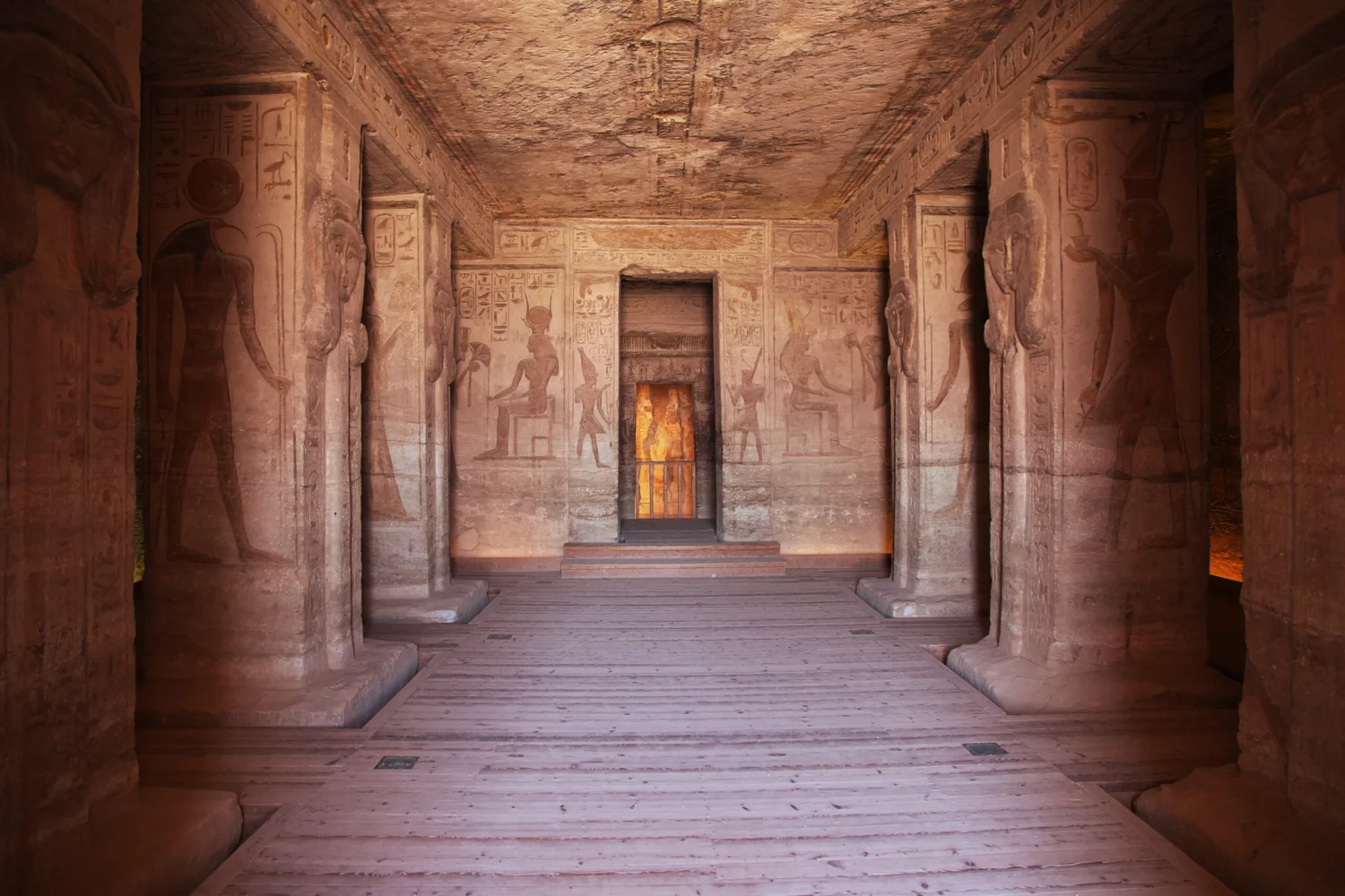 El templo de Abu Simbel, un complejo formado por dos templos excavados en la roca, uno de ellos dedicado a Ramsés II y el otro a Nefertari, su primera y favorita esposa. El complejo está formado por dos templos. El Gran Templo a los dioses divinizados Ra-Horakty, Ptah y Ramsés II, y el Templo Menor a la diosa Hathor y la reina Nefertari. El templo cuenta con cuatro colosos sedentes flanqueando la entrada, dos a cada lado, que representan a Ramsés II en su trono. Debajo de estas gigantescas figuras hay estatuas más pequeñas que representan a los enemigos conquistados de Ramsés. Hay más estatuas que representan a varios miembros de la familia y algunos dioses protectores y símbolos de poder. Pasando entre los dos colosos, se accede al interior del templo, que está decorado con grabados que muestran a Ramsés y Nefertari rindiendo homenaje a los dioses.