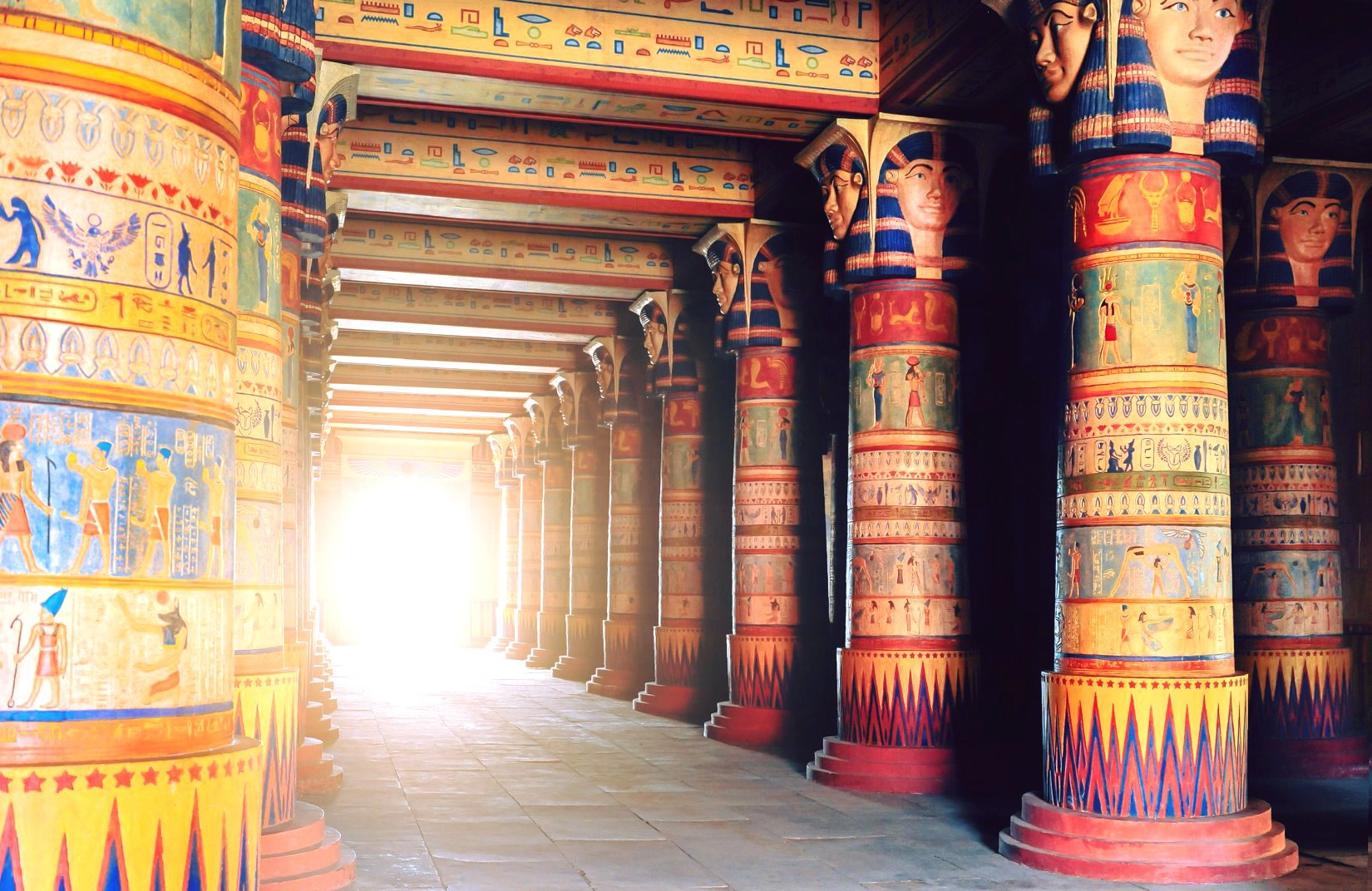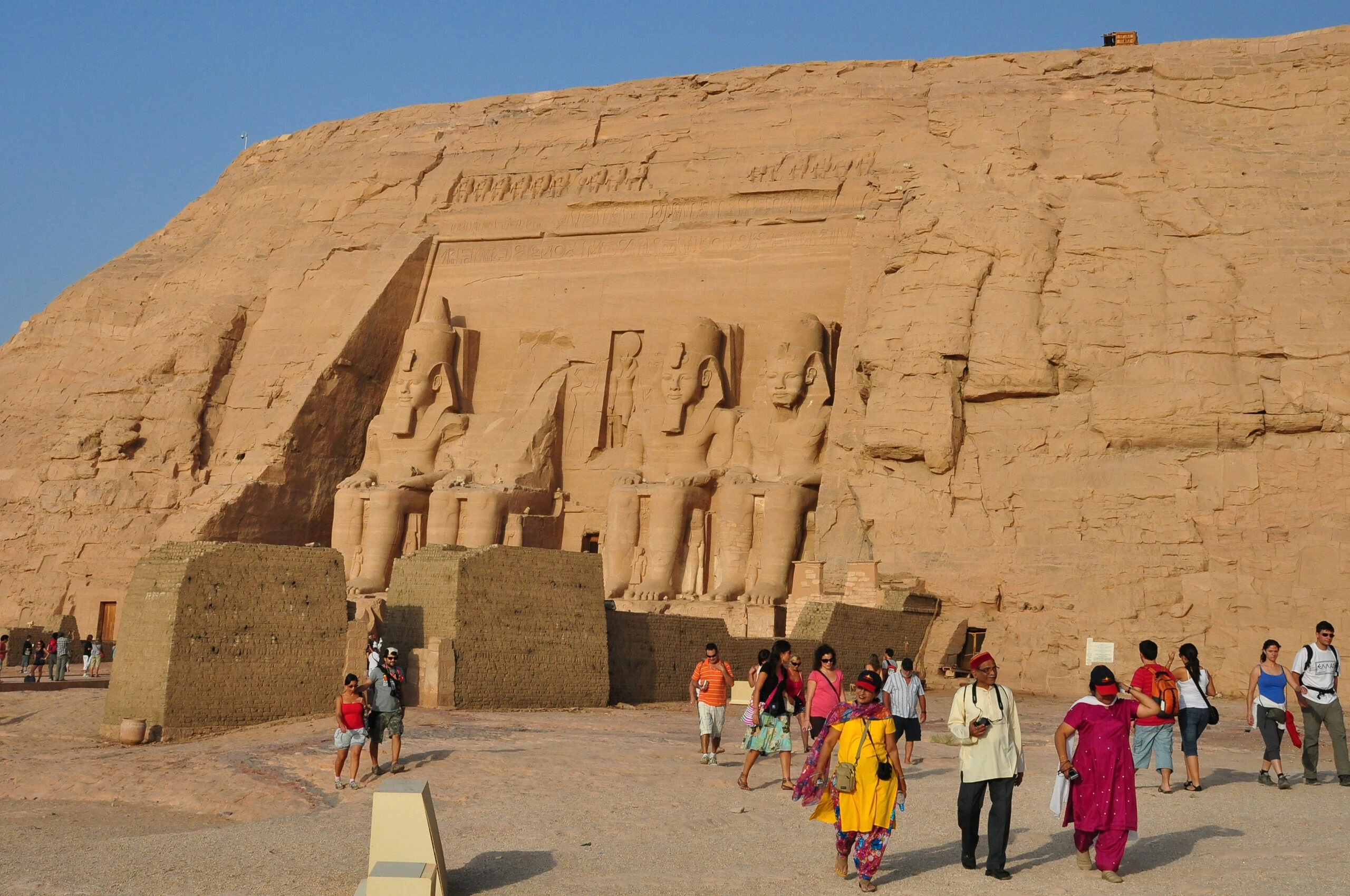El templo de Abu Simbel, un complejo formado por dos templos excavados en la roca, uno de ellos dedicado a Ramsés II y el otro a Nefertari, su primera y favorita esposa. El complejo está formado por dos templos. El Gran Templo a los dioses divinizados Ra-Horakty, Ptah y Ramsés II, y el Templo Menor a la diosa Hathor y la reina Nefertari. El templo cuenta con cuatro colosos sedentes flanqueando la entrada, dos a cada lado, que representan a Ramsés II en su trono. Debajo de estas gigantescas figuras hay estatuas más pequeñas que representan a los enemigos conquistados de Ramsés. Hay más estatuas que representan a varios miembros de la familia y algunos dioses protectores y símbolos de poder. Pasando entre los dos colosos, se accede al interior del templo, que está decorado con grabados que muestran a Ramsés y Nefertari rindiendo homenaje a los dioses.