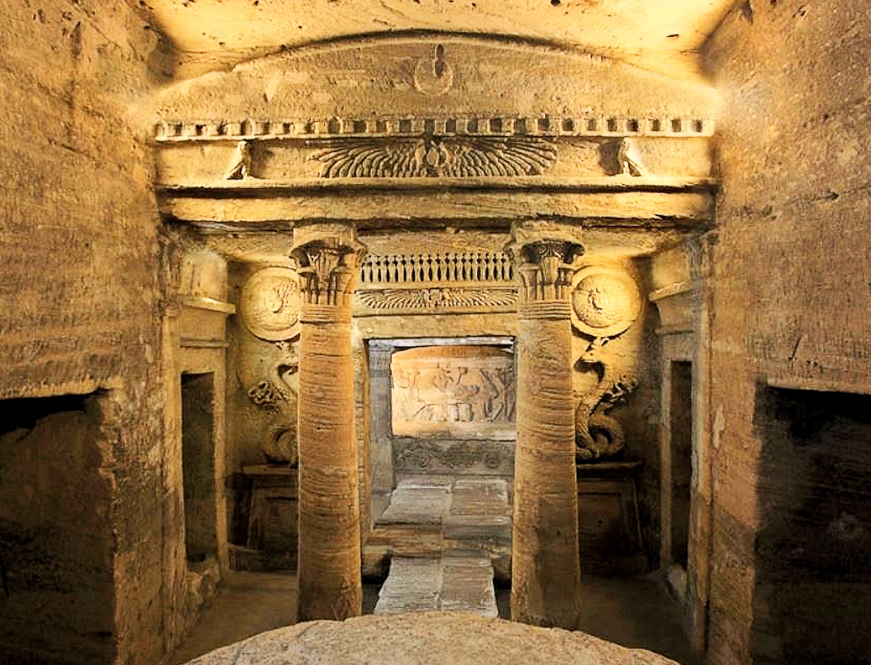Llegada y visita a las catacumbas de KOM EL-SHOQAFA, tumbas de la época romana con tres niveles subterráneos, constituyen una de las atracciones históricas más importantes de Alejandría y una de las más visitadas por los turistas que visitan Egipto. Estas catacumbas de estilo romano son maravillosos ejemplos de la influencia del arte del Antiguo Egipto en el arte romano.
