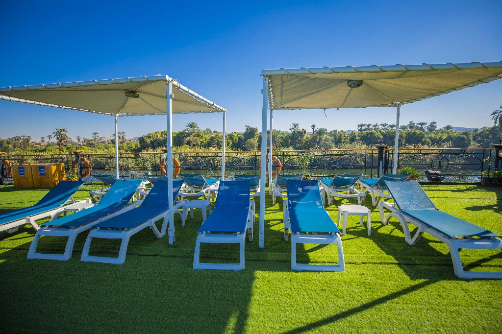 A bordo del MS Blue Shadow Nile Cruise, los huéspedes pueden disfrutar de espectáculos de danza y música tradicionales, relajarse y refrescarse en nuestro exquisito spa, en nuestra piscina, en la terraza o en la comodidad de sus lujosos camarotes.
