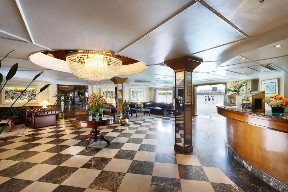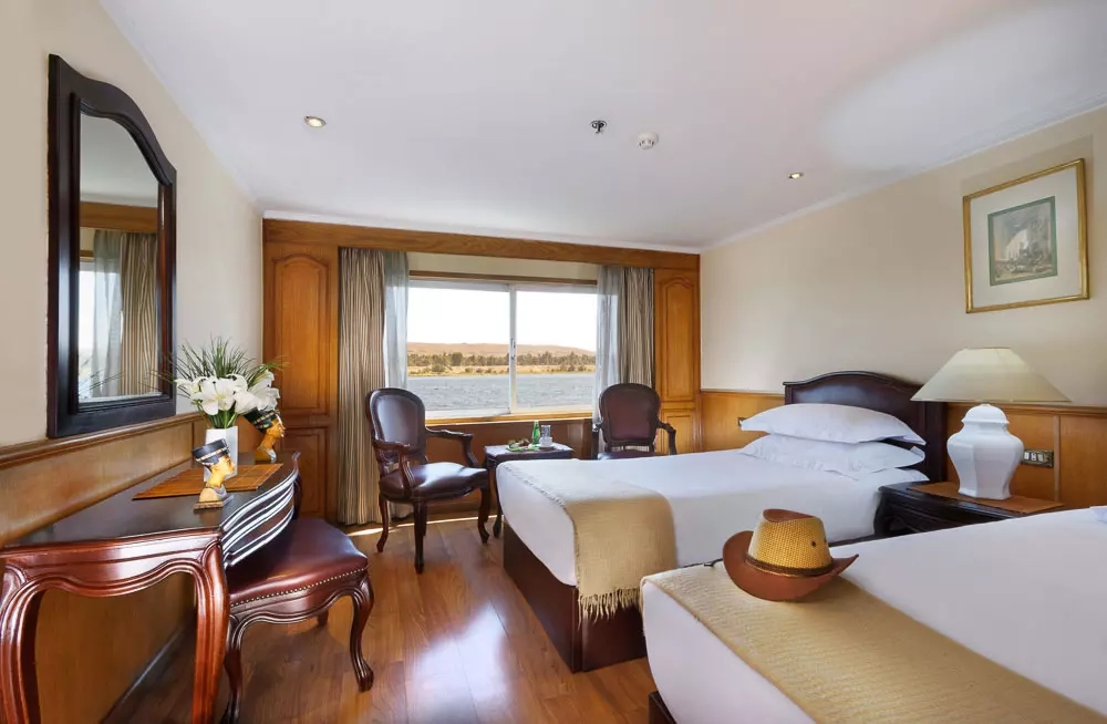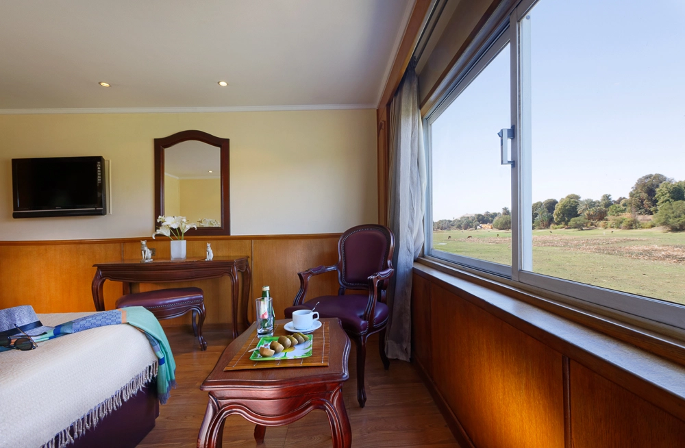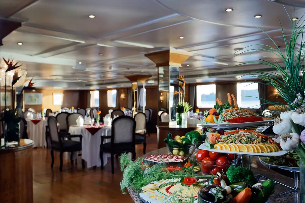 Este impresionante barco es uno de los más lujosos de todos los barcos del Nilo. Elegantemente decorado con ricas telas, paneles de madera y muebles de estilo clásico, este barco ofrece un entorno refinado para su crucero por el Nilo. El restaurante ofrece 120 comensales con una combinación de servicio de camareros y comidas tipo buffet que le permiten degustar tanto la cocina egipcia como la internacional.