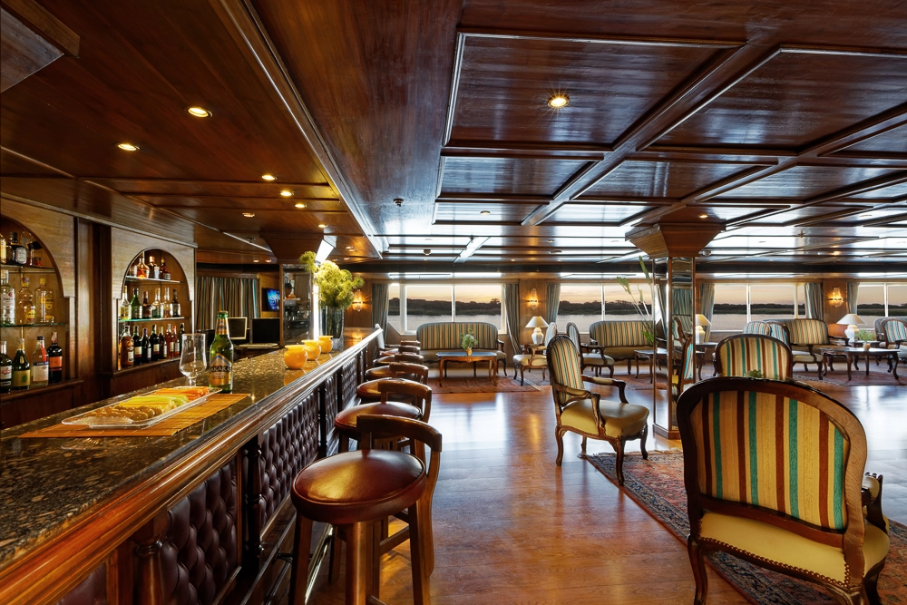El espacioso bar del salón está decorado con gusto y ofrece servicio de bar internacional. El salón principal tiene un sistema de música y una pista de baile para el entretenimiento nocturno, que incluye un espectáculo de folclore egipcio y danza del vientre. La zona del bar independiente con cómodos sofás Chesterfield ofrece una vista panorámica del río Nilo y un lugar tranquilo para relajarse con un libro. En la cubierta superior, la terraza para tomar el sol se extiende a lo largo y ancho del barco con equipos de fitness, piscina y bar rodeado de elegantes mesas de mimbre, sillas y tumbonas.